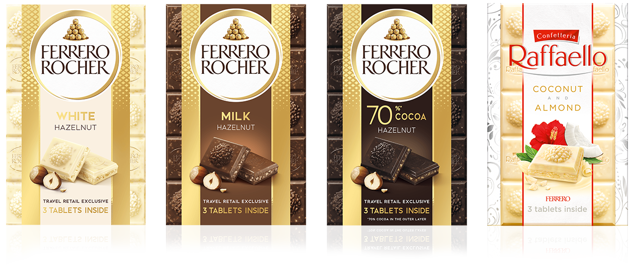 Ferrero Rocher chocolate bars are sealed in hermetic aluminium foil within a cardboard case to preserve taste and quality.