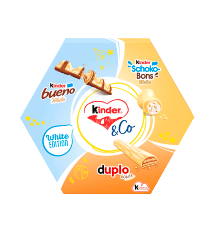Introducing Kinder & Co White 137g: the new white chocolate mix of iconic Kinder and Ferrero brands, ideal for sharing or enjoying on your own. Inside, you’ll find exclusively the white chocolate Duplo bar. The mix includes 2 Kinder Bueno White, 4 Kinder Schoko-Bons White and 2 Duplo White.